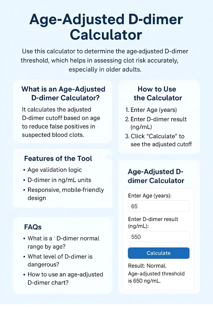 The Age-Adjusted D-dimer Calculator is a simple yet powerful tool for clinicians and patients to interpret D-dimer test results more meaningfully. Whether you’re managing your health proactively or confirming a diagnosis, this tool can help eliminate ambiguity—especially for those over 50.
