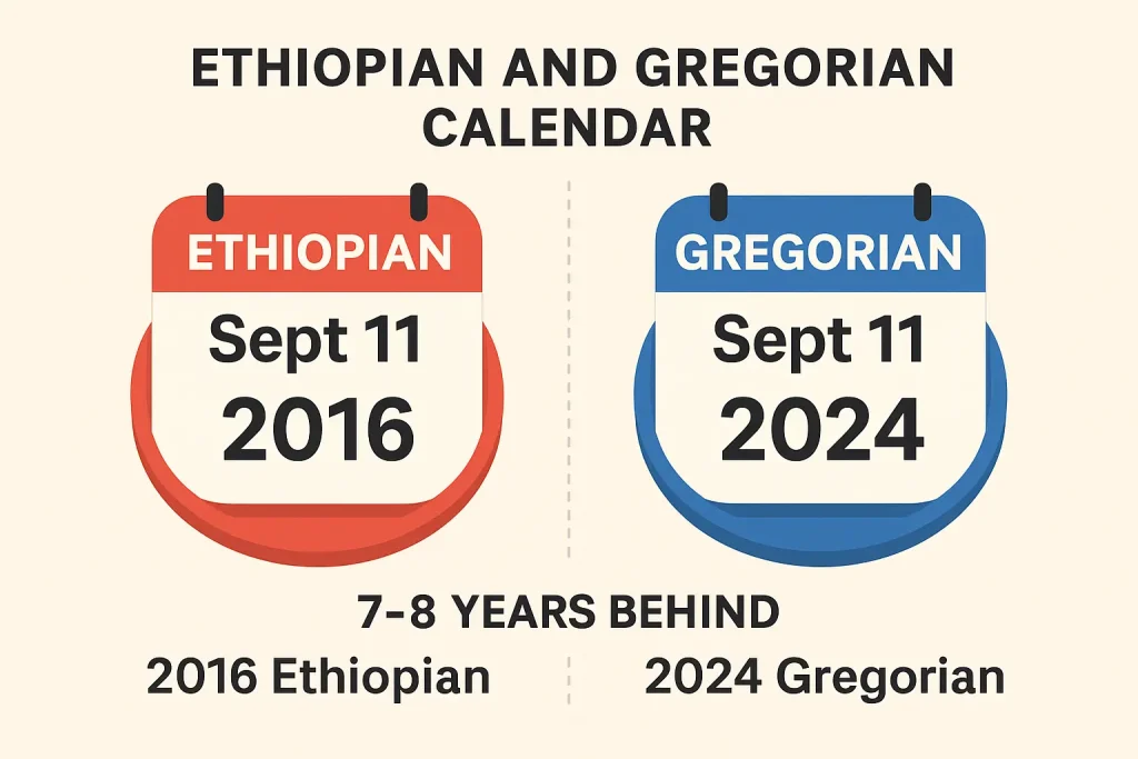 The Ethiopian calendar year is about 7–8 years behind the Gregorian calendar. For example, the Ethiopian year 2015 corresponds to 2023 in the Gregorian system.