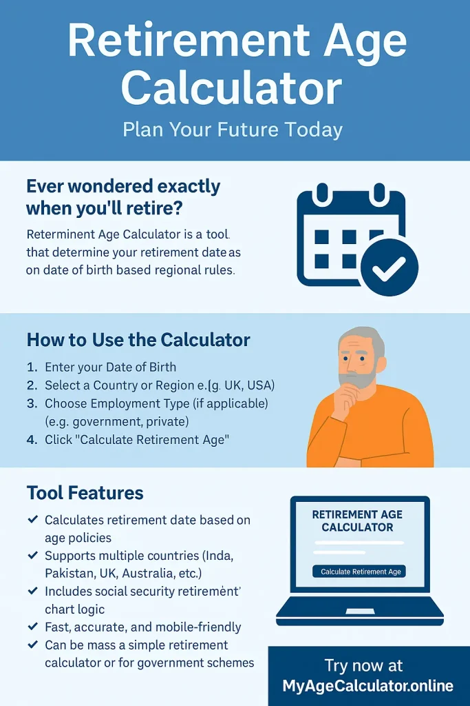 Ever wondered exactly when you’ll retire? Whether you’re a government employee in India or planning your social security benefits in the U.S., knowing your exact retirement date is crucial. That’s where our Retirement Age Calculator by Date of Birth comes in — a simple, fast, and accurate tool tailored to meet various regional and government-specific retirement rules.